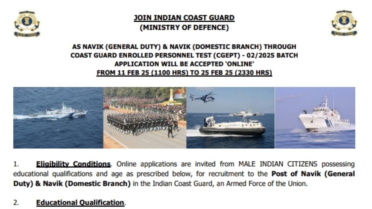 Joint Indian Coast Guard bharti 2025 :ज्वाइंट कोस्ट गार्ड में 300 पदों पर भर्ती का नोटिफिकेशन जारी