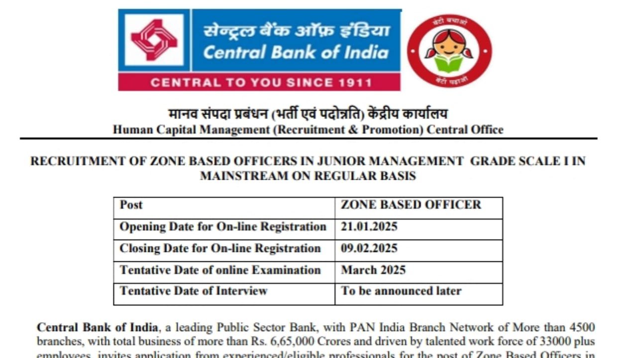 सेंट्रल बैंक ऑफ इंडिया में 266 पदों पर भर्ती; सैलरी 85 हजार से ज्यादा