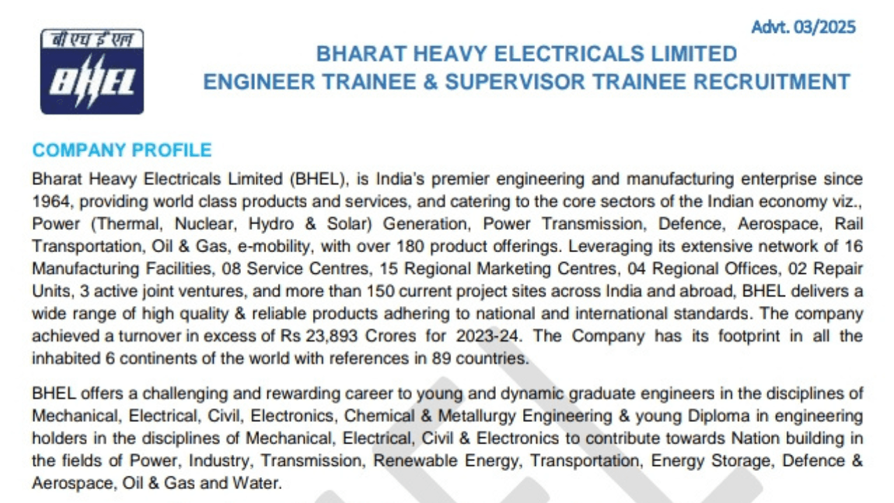 BHEL Recruitment 2025:BHEL में 400 पदों पर भर्ती का नोटिफिकेशन जारी