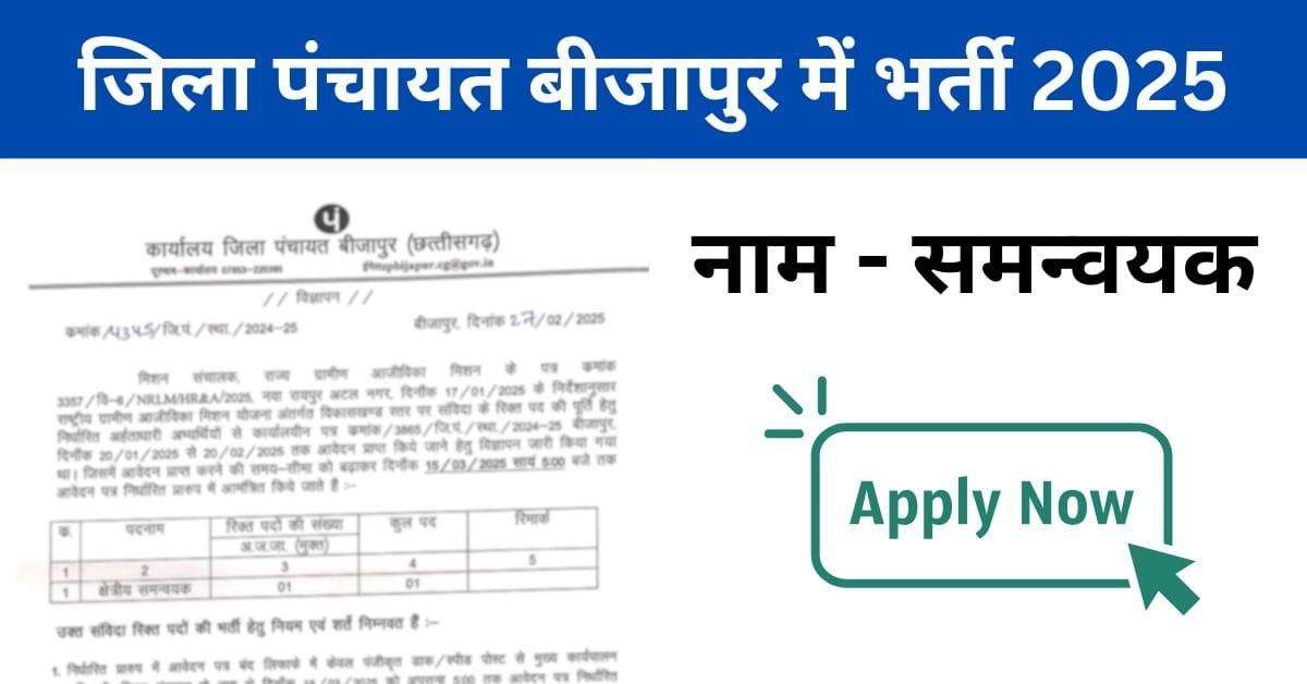 Bijapur Jila Panchayat Vacancy 2025: जिला पंचायत बीजापुर में क्षेत्रीय समन्वयक के पदों पर भर्ती 2025