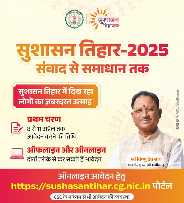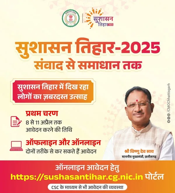 Sushasan Tihar 2025:- सुशासन तिहार 2025 छत्तीसगढ़ राज्य सरकार द्वारा आयोजित एक महत्त्वपूर्ण अभियान है, जिसका उद्देश्य आम जनता की समस्याओं का समाधान करना, विकास कार्यों में गति लाना, और जनता एवं सामाजिक संगठनों के साथ सीधा संवाद स्थापित करना है। आप अपनी समस्या अथवा मांग की ऑनलाइन आवेदन अपने मोबाइल से कर सकते है। आपके ग्राम में जो भी समस्या है, आपकी समस्या जैसे- आवास, शौचालय, जमीन पट्टा संबंधी मांग की ऑनलाइन आवेदन कर सकते है। आपकी मांग एवं समस्या का 01 माह के अंदर समाधान किया जायेगा।